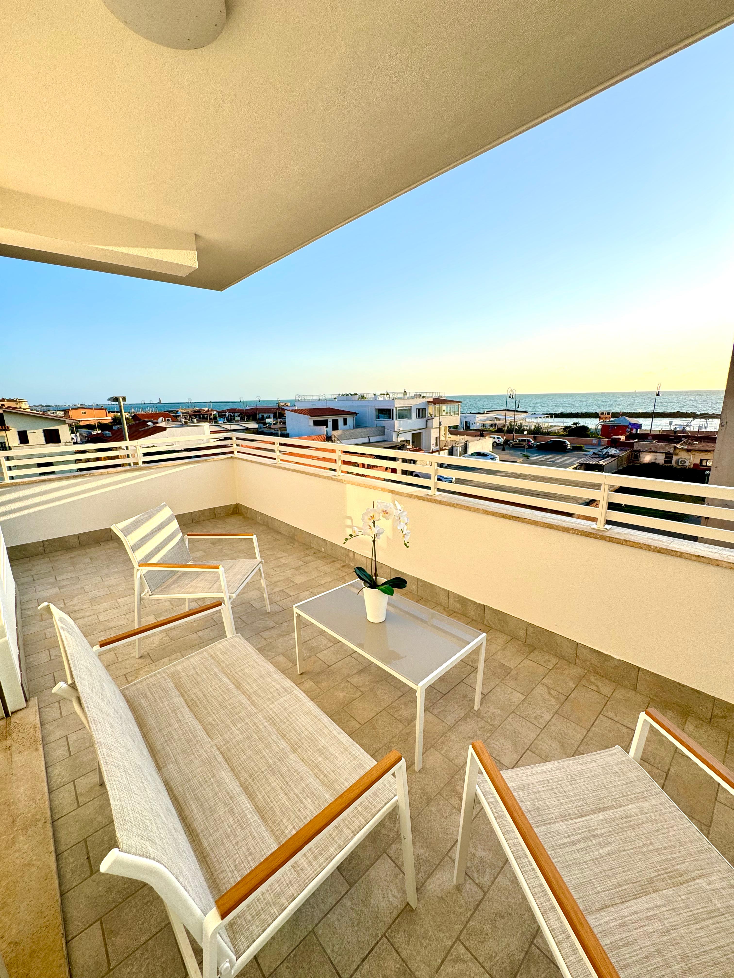 Il grande terrazzo affaccia direttamente sul mare di Fiumicino.