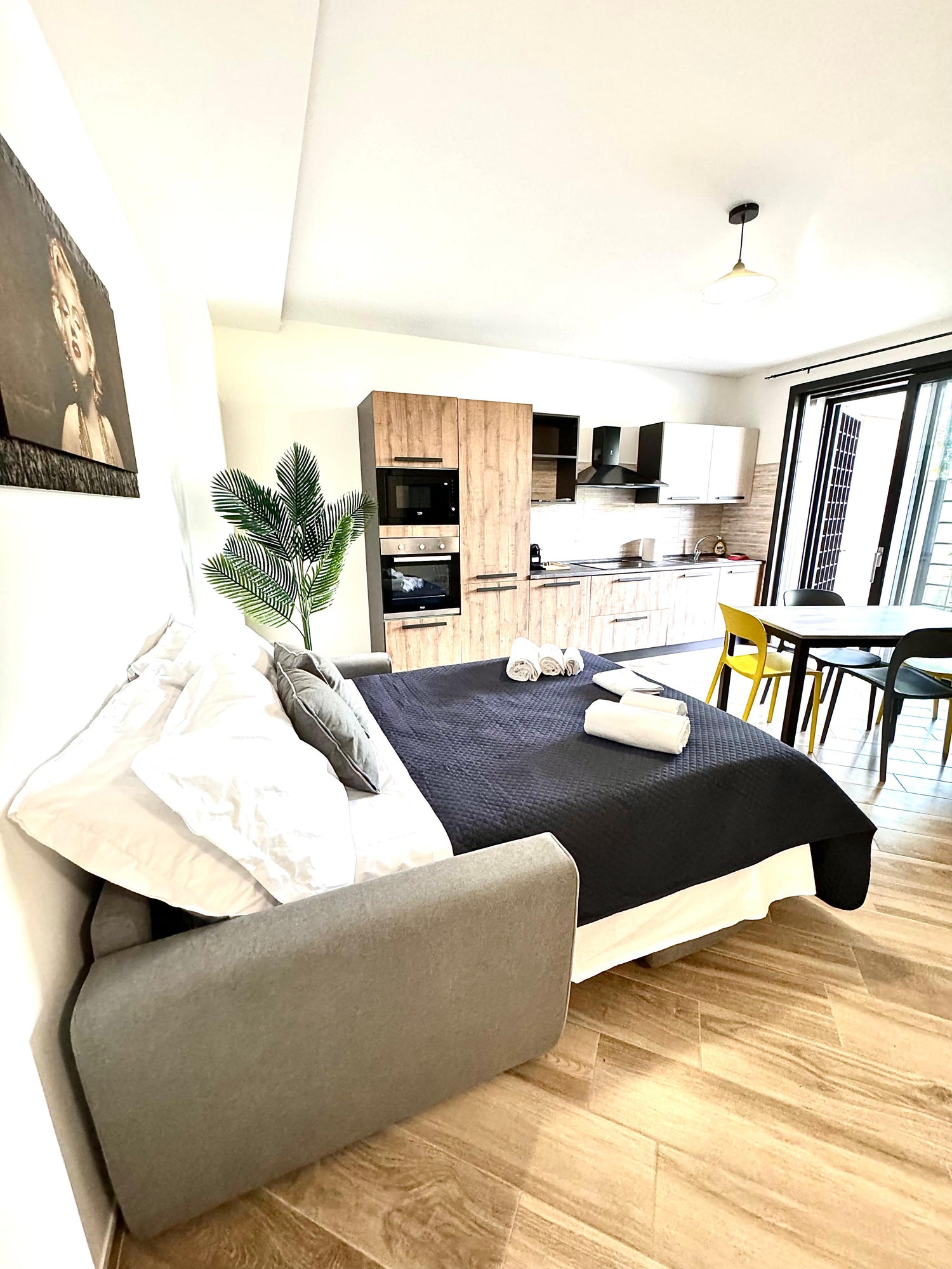 L'appartamento e' un bellissimo e accogliente monolocale dotato di un divano letto, una smart tv, un bagno con doccia e un angolo cottura molto ben fornito con microonde, forno, lavastoviglie e macchina del caffe' Nespresso.